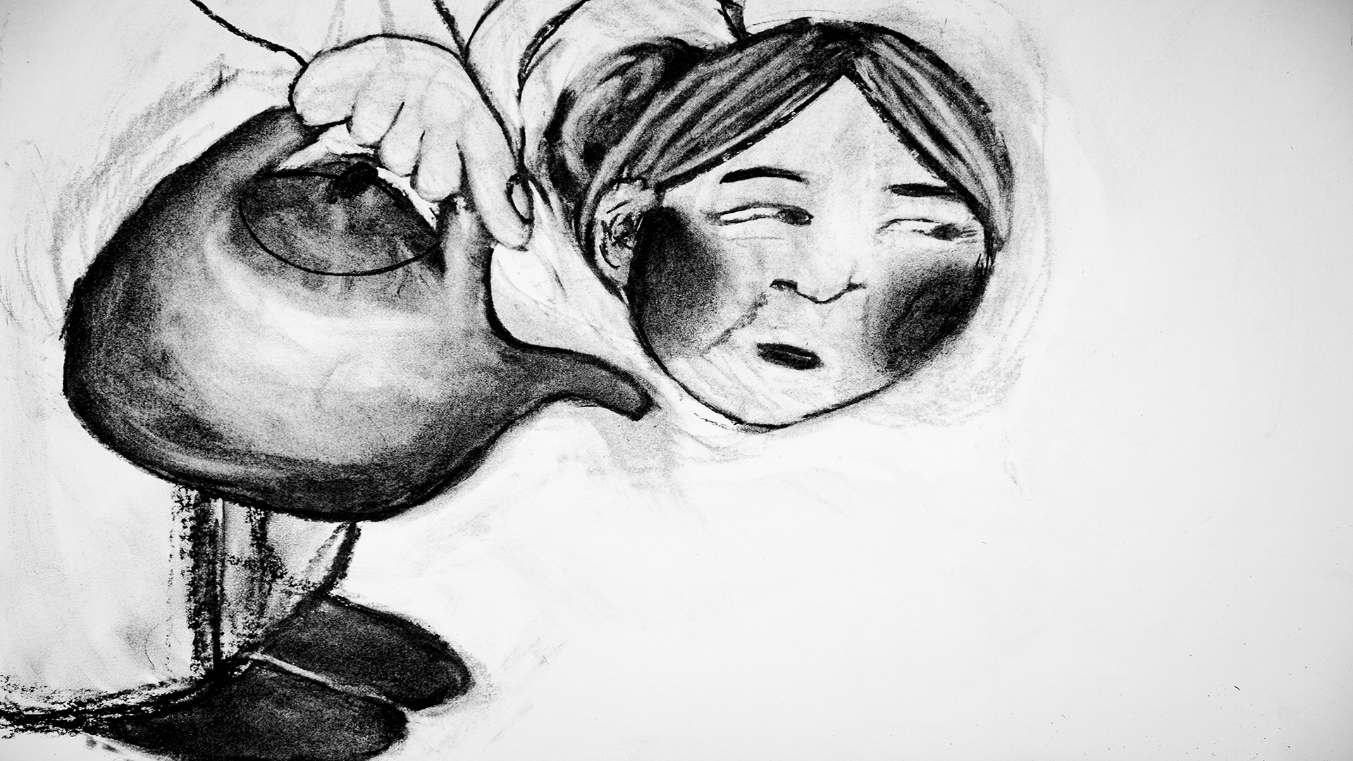 A second Kyirong film is an animation called Yarlung (2020), which tells the story of three children in a rural village who experience relief from their grief over the death of a loved one through their connection to the Yarlung Tsangpo River. The film blends fiction with non-fiction, as the artist draws on her personal experiences as a child visiting a small Tibetan refugee settlement in Northeast India where her mother was born.