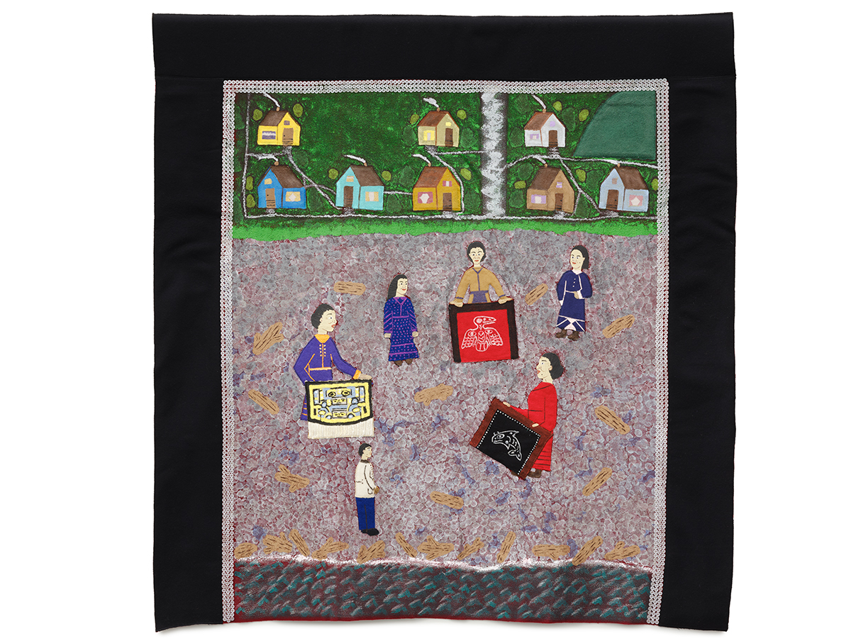 Drawing on the distinctive form and techniques of traditional “button blankets” of the Northwest Coast—robes typically adorned with an individual’s family or clan crests—Hazel Wilson’s works are a radical departure in terms of their representational quality, bringing her practice into the realm of history painting and folk art. The history robes index the innovative ways in which Haida and Indigenous artists continuously expand on traditional forms to speak to a changing world.
